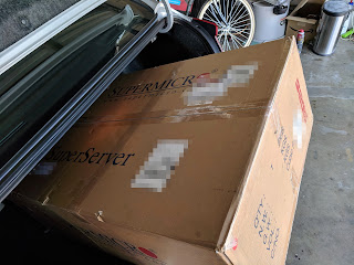 The Raptor Talos II (see my previous posts for more) arrives in an 80-pound box. It's a good thing I already had mesh put in for my hernia surgery because I needed it today, by golly. No complaints about the packaging as the unit came very well protected. Gorgeous wife unwillingly positioned for scale (she is 5'4"); the computer is lengthwise and rather longer than your typical tower system: