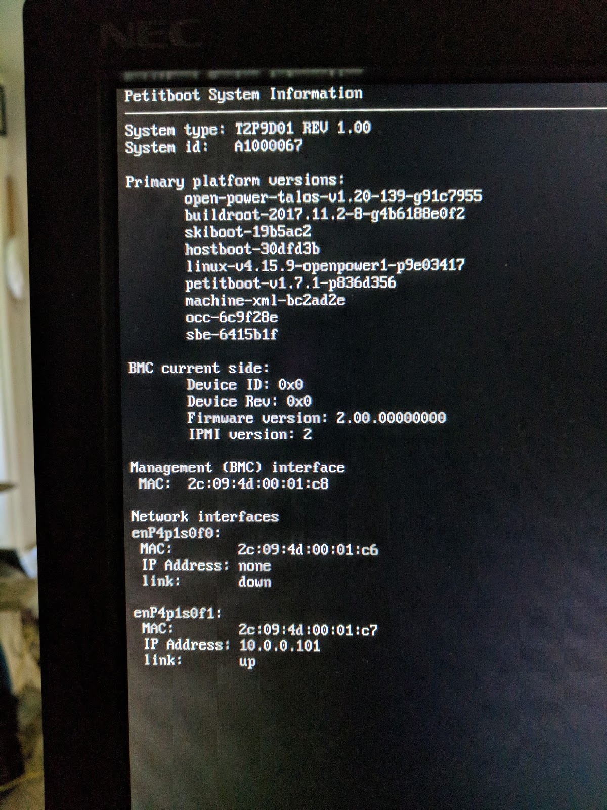 Right now the firmware is up to date, though I would be remiss not to try to rebuild it from scratch at some point to personally audit it (since the NSA is probably all upin my bidness now for having purchased the thing). I was able to get into the BMC and talk to it from the G5 and all of the hardware seems to be in working order. However, I haven't had much success with actually booting it because I have and want to use my discrete AMD GPU, meaning I'll preferentially need to find a distro with Linux 4.16 or later. (I could use something earlier if I really wanted to, but it would require some jumping through hoops with a serial terminal that I don't really feel like doing right now.) Fedora 28 seems the best bet for getting something working, and then we can see where we're at as other distros catch up.